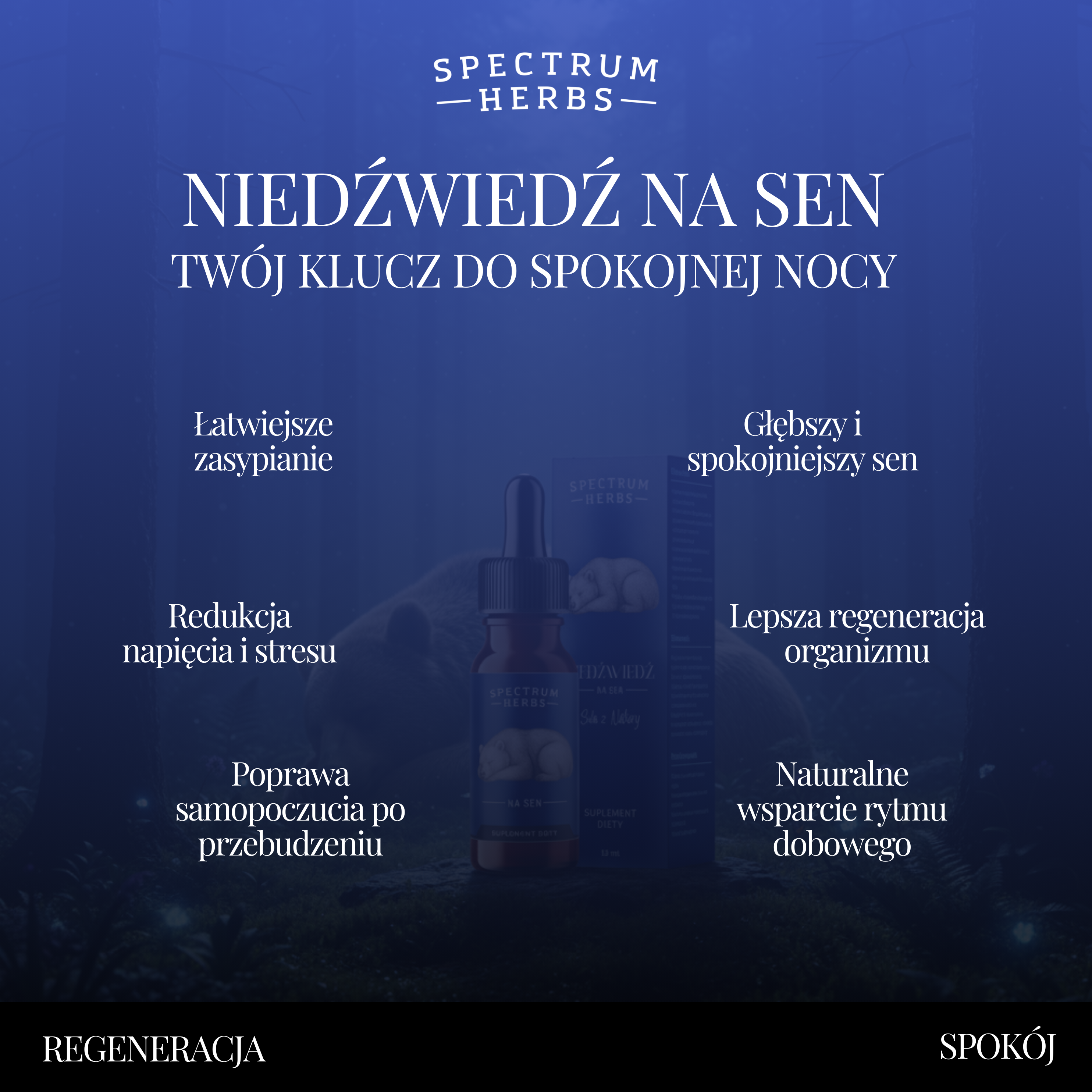 Pierwsze rezultaty można zauważyć już po kilku dniach regularnego stosowania – poprawa jakości snu, łatwiejsze zasypianie i głębsza regeneracja. Aby wspomóc działanie Niedźwiedzia, warto unikać wieczorem kawy, zielonej herbaty, alkoholu i innych używek, które mogą zakłócać naturalny cykl snu.